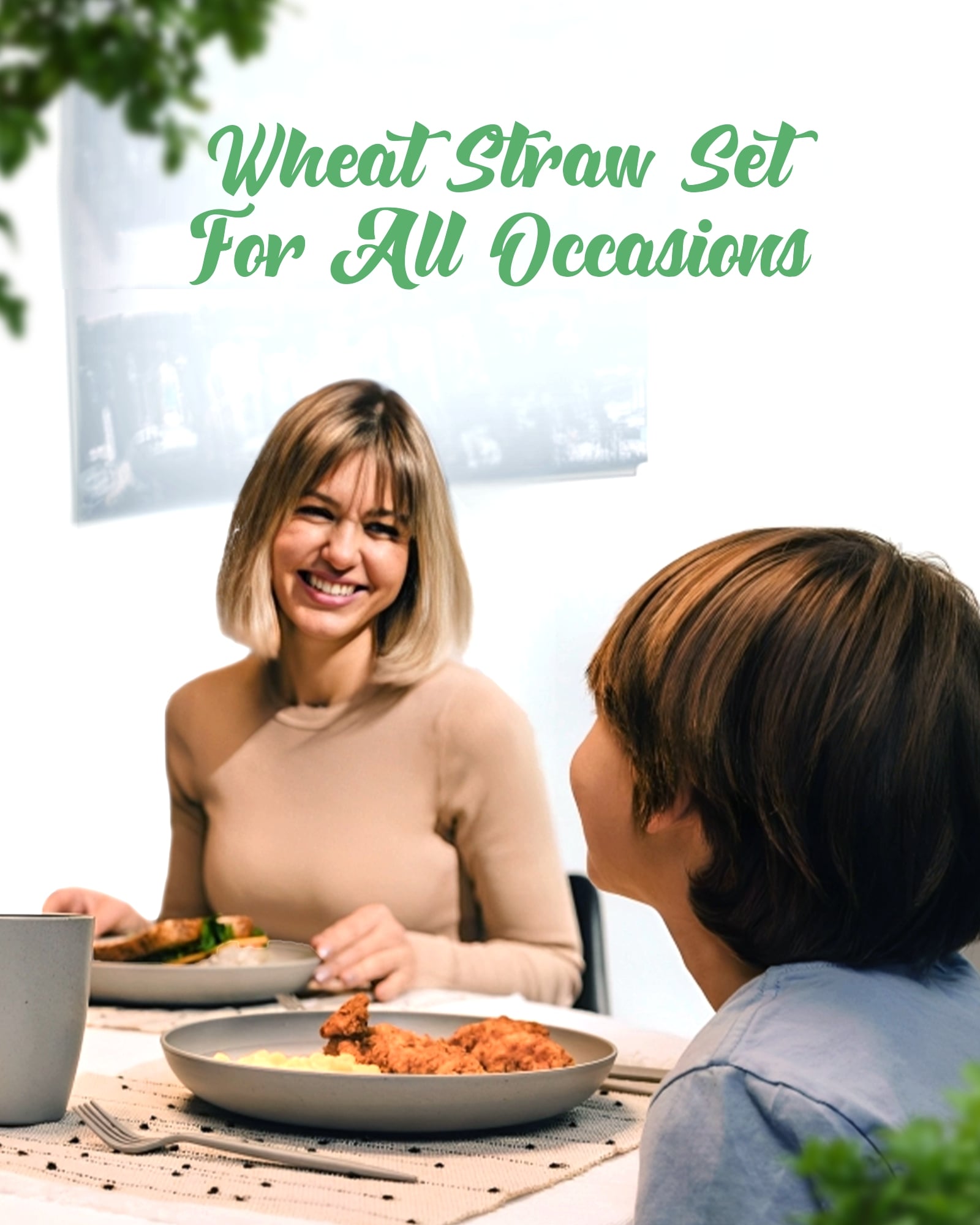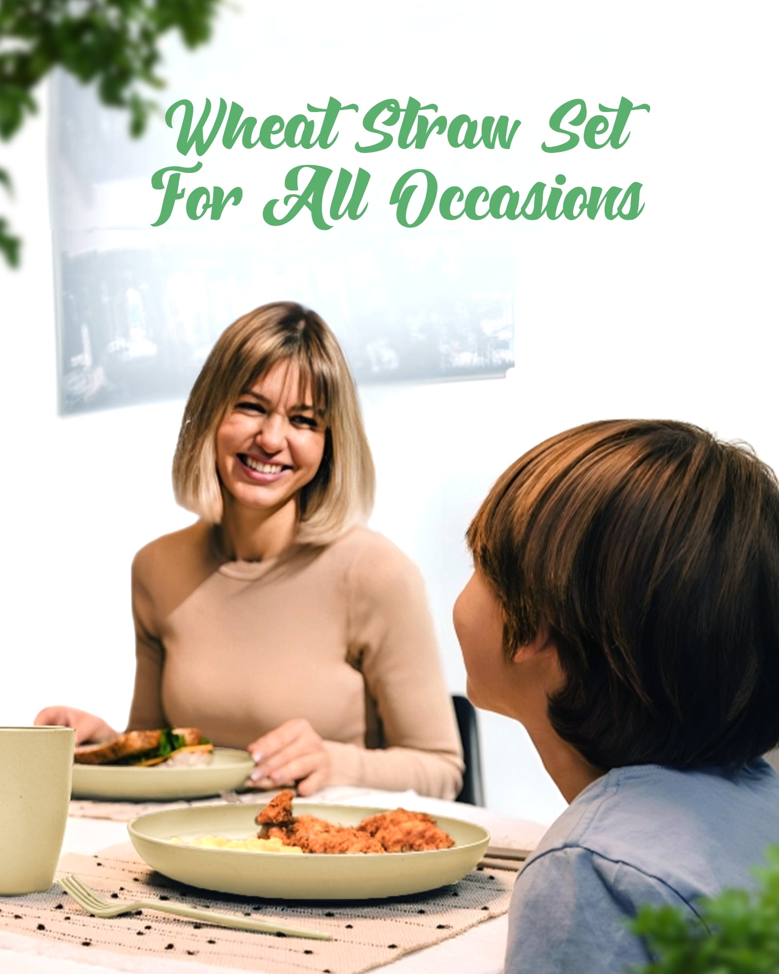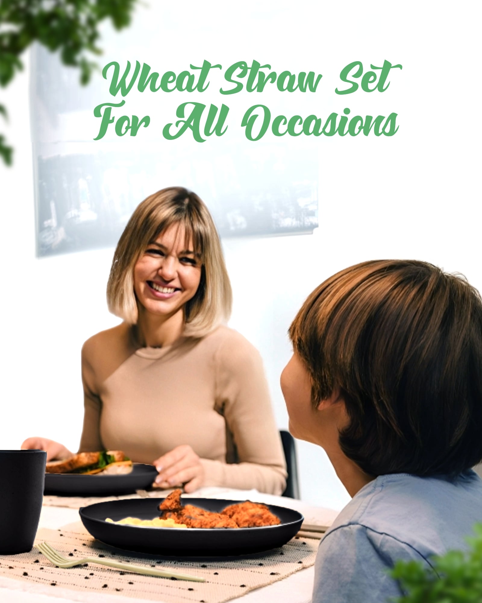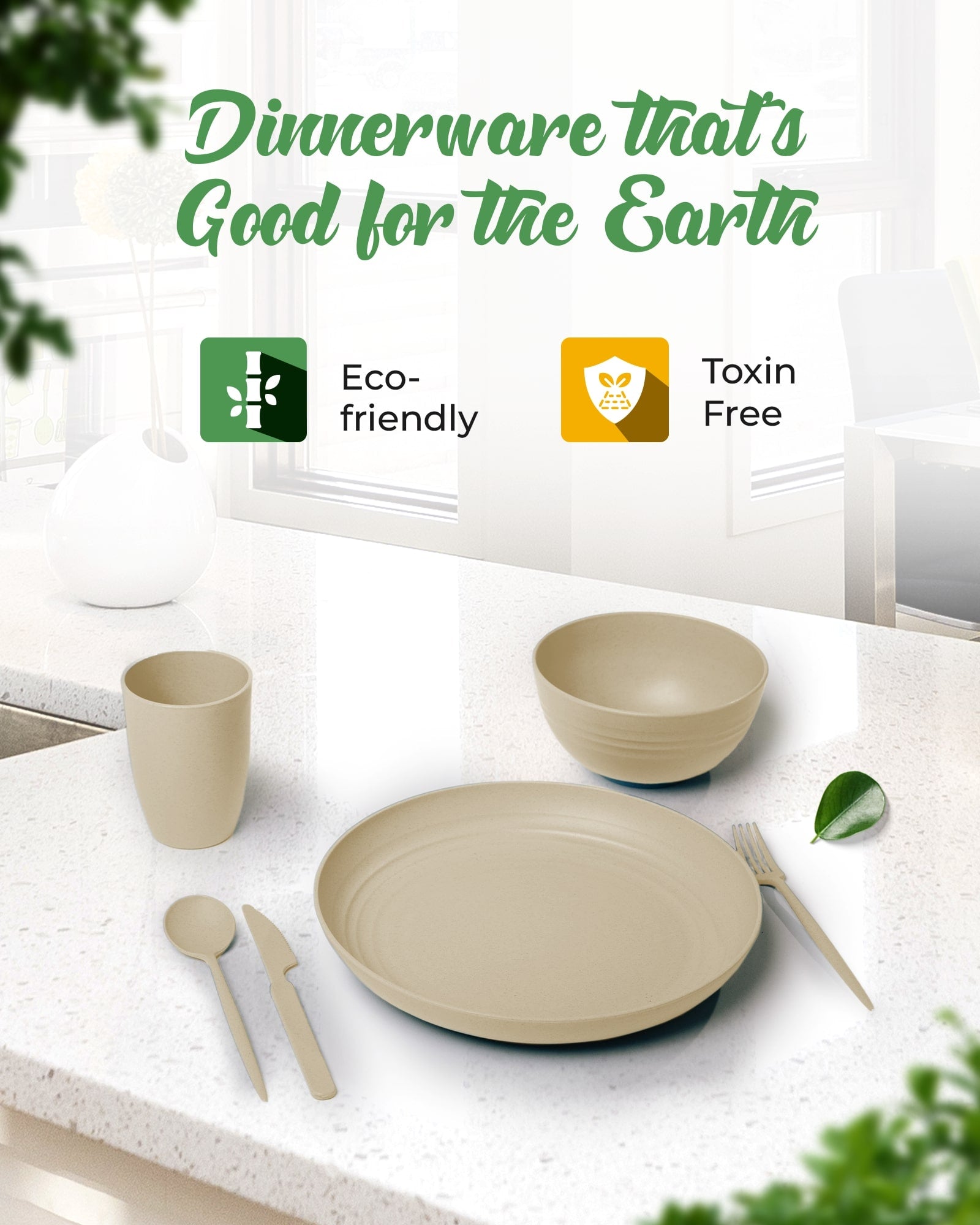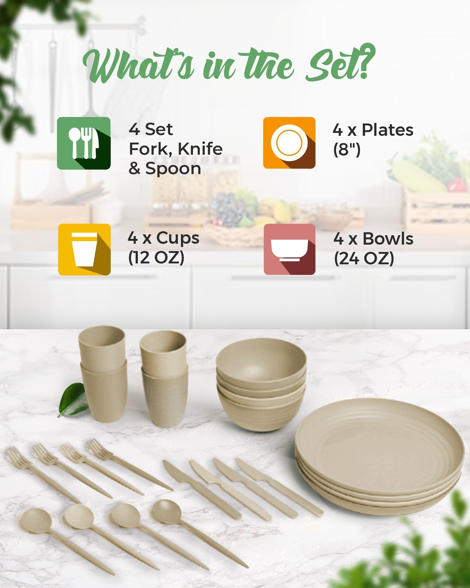 - Complete Wheat Straw Dinnerware Set: A stylish and durable dinnerware set, including plates, bowls, cups, and utensils made from microwavable wheat straw/plastic, perfect for an upscale tabletop presentation. The set contains 4 Plates, 4 Bowls, 4 Cups, and 4 Cutlery sets.