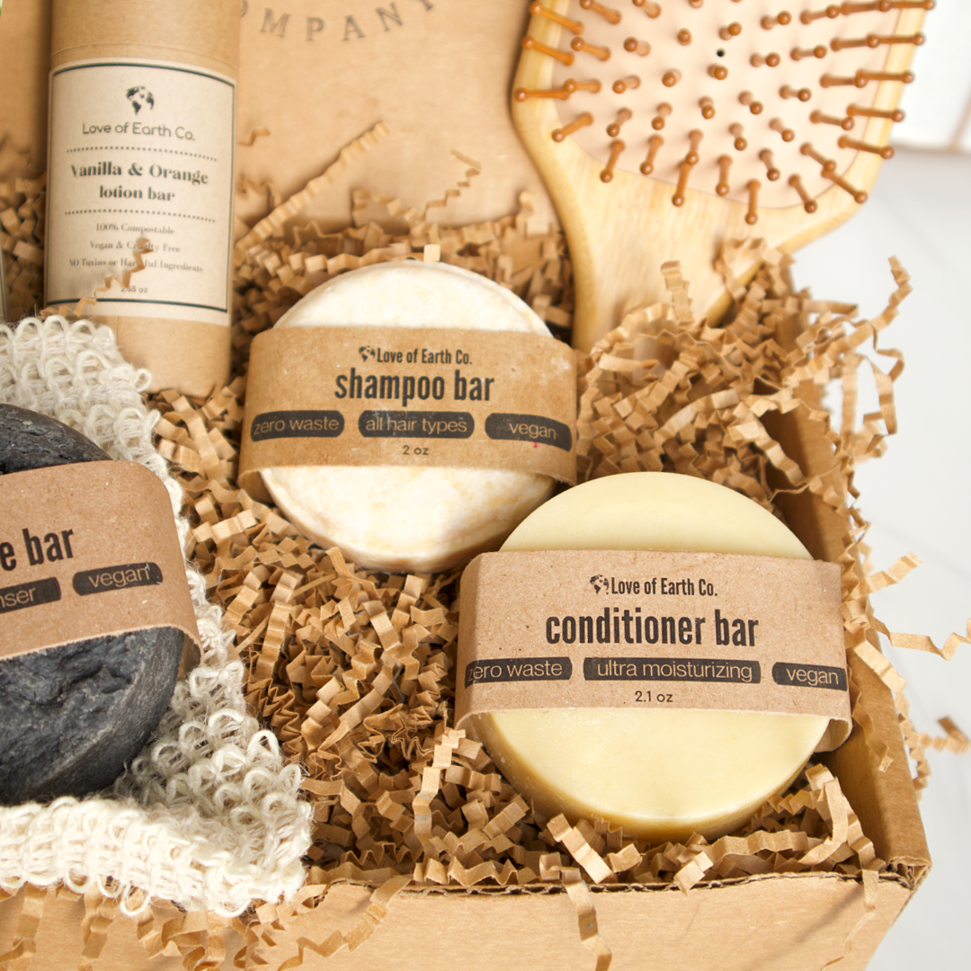 All items in the box (excluding the hair brush) are locally handmade. All packaging of these products are 100% compostable & certified eco-friendly.