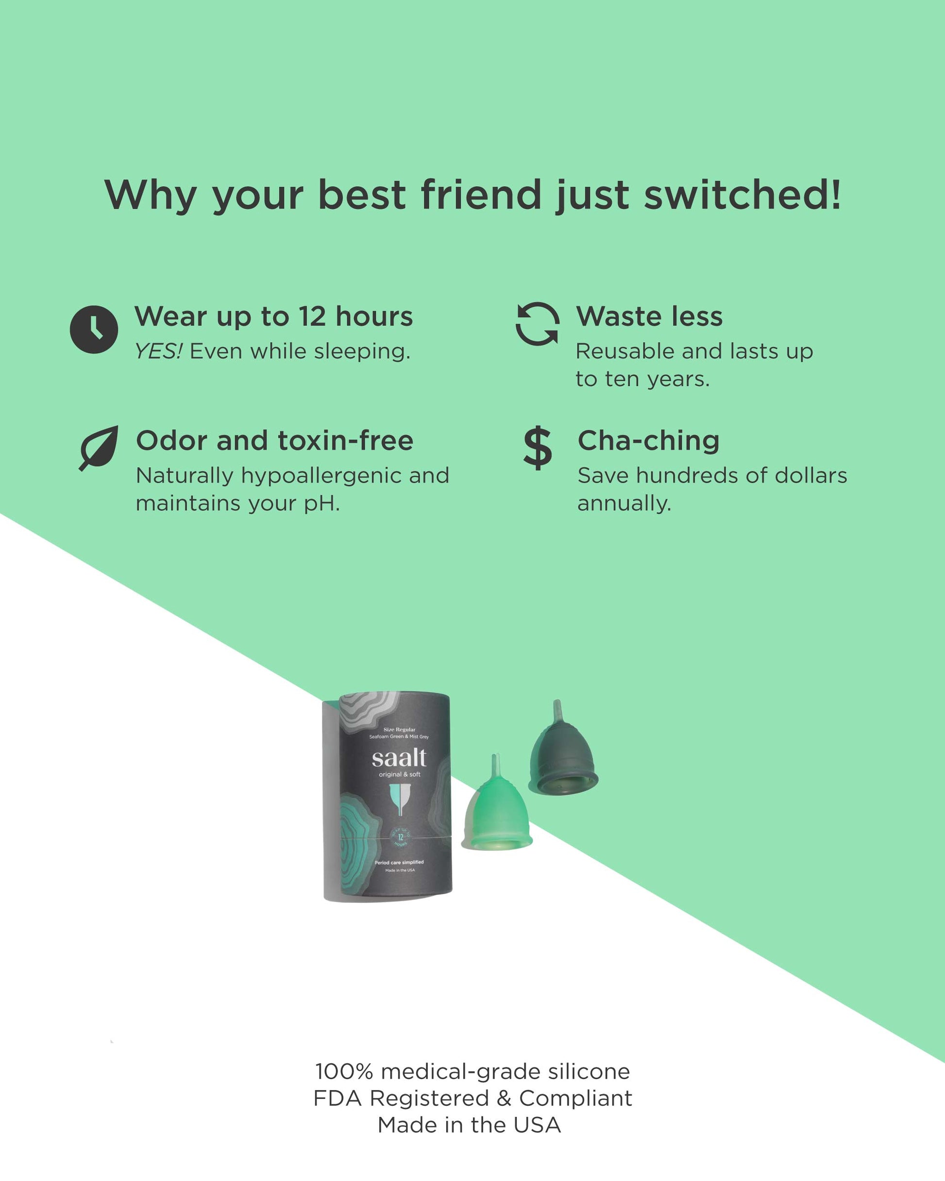 Why you’ll love it: Better together. The Twin Pack comes with both our original Saalt Cup and Saalt Soft Cup so you can find which firmness works best for different days of your period. The Saalt Soft is a great option for those cramping and sensitive days, and the Saalt Cup may work best for your more physically active days.